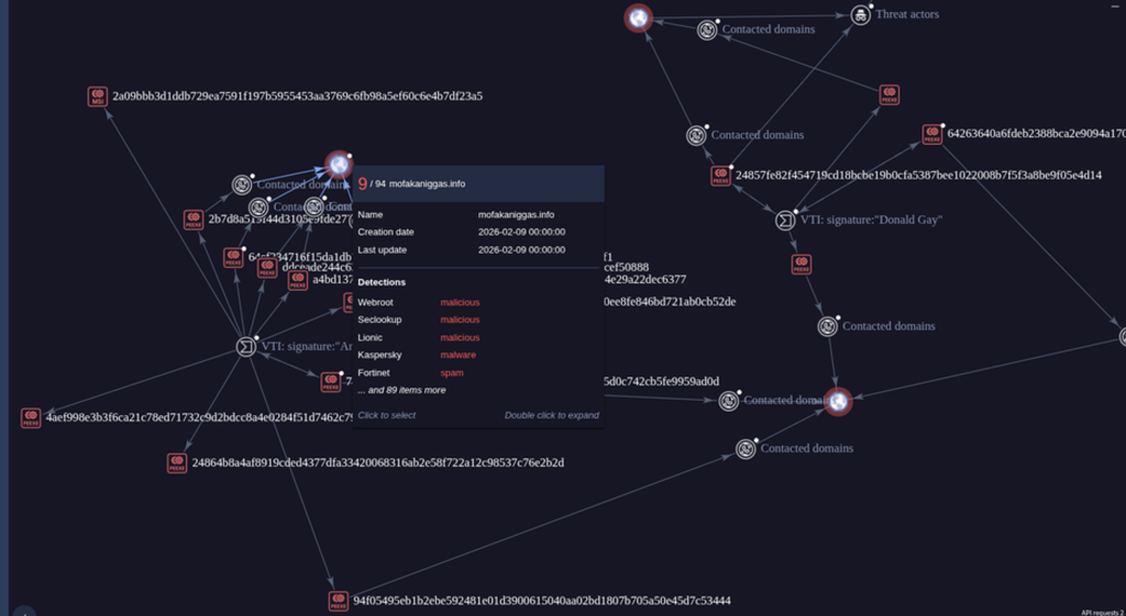O nó central visível no grafo é o domínio mofakaniggas[.]info, registrado em 9 de fevereiro de 2026 — aproximadamente três semanas antes do início das operações cinéticas — e classificado como malicioso por múltiplos motores de detecção, incluindo Webroot, Seclookup, Lionic, Kaspersky e Fortinet (9 detecções em 94 verificações).
