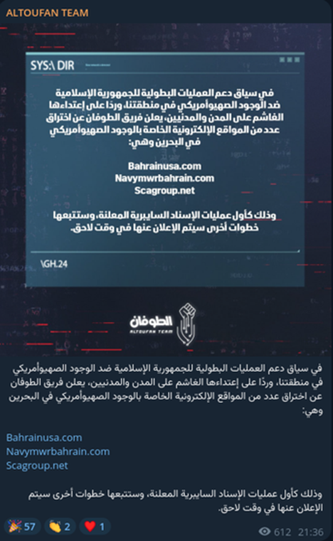 “Em continuidade ao apoio às operações heroicas da República Islâmica contra a presença sionista e americana na nossa região, e em resposta à sua agressão brutal contra cidades e civis, a equipe “Al-Toufan” anuncia a invasão (hackeamento) de vários sites eletrônicos ligados à presença sionista e americana no Bahrein, que são: