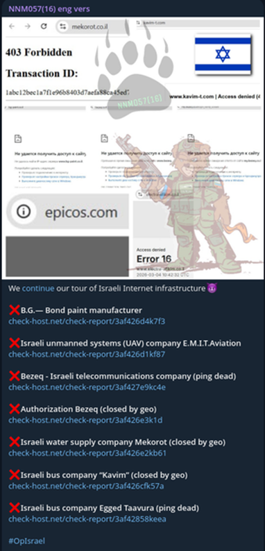 Na segunda imagem, o mesmo grupo detalha uma campanha mais ampla de negação de serviço contra alvos israelenses de múltiplos setores, acompanhada de capturas de indisponibilidade e relatórios do check-host.net como comprovação. Entre os alvos reivindicados estão a Mekorot, principal empresa de abastecimento de água de Israel; a Bezeq, maior operadora de telecomunicações do país; as empresas de transporte público Kavim e Egged Taavura; a E.M.I.T. Aviation, fabricante de sistemas aéreos não tripulados (UAVs); e a Bond, do setor industrial. A amplitude e a diversidade setorial dos alvos — água, telecomunicações, transporte, defesa e indústria — evidenciam uma abordagem deliberada de pressão sobre múltiplos pilares da infraestrutura crítica israelense.