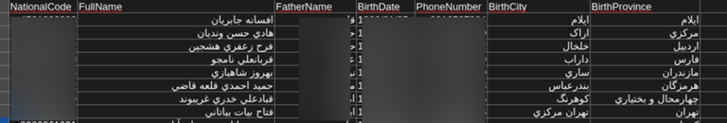 O arquivo sample.csv contém aproximadamente 2.000 registros de cidadãos iranianos com código nacional, nome, nome do pai, data de nascimento, telefone, cidade e província de nascimento — consistente com dados do registro civil mencionados no anúncio original.