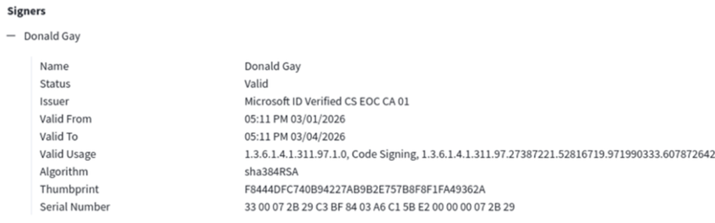 Um detalhe que merece destaque é a assinatura digital presente nos artefatos do cluster. Os binários associados à campanha utilizam um certificado de code signing emitido em nome de “Donald Gay”, válido por apenas 3 dias — de 01/03/2026 a 04/03/2026 — coincidindo exatamente com o período imediato pós-assassinato de Khamenei e início da retaliação iraniana. O certificado, emitido pela autoridade Microsoft ID Verified CS EOC CA 01 com algoritmo sha384RSA e status válido, foi obtido através do programa de verificação de identidade da Microsoft para code signing — um mecanismo legítimo abusado pelos operadores para conferir aparência de legitimidade aos payloads.