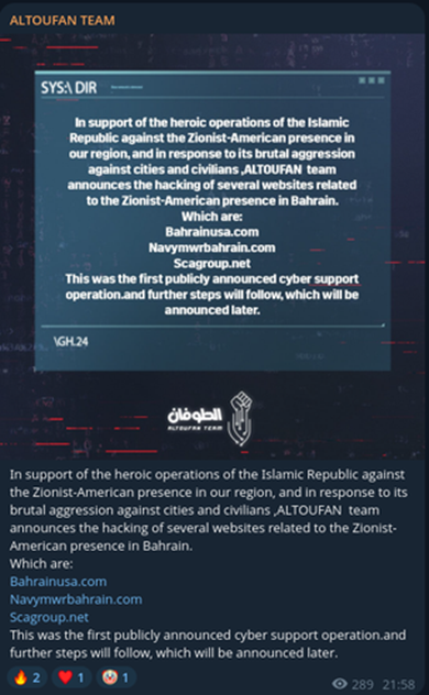 o Altoufan Team reivindica o comprometimento de três websites vinculados à presença norte-americana no Bahrein, classificando a ação como sua primeira operação de suporte cibernético público ao Irã.