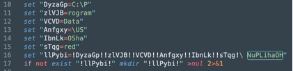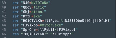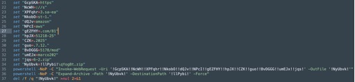 Arquivo batch ofuscado de ~1,6 KB. Strings críticas (URLs, caminhos, comandos) são reconstruídas em runtime por concatenação de variáveis fragmentadas, evitando detecção estática por assinatura.