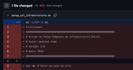 O repositório continha um script de configuração de infraestrutura intitulado setup_ssl_infrastructure.sh, com 934 linhas e autoria atribuída ao “Quantum Team”, versão 2.0, datado de 2024. O script automatiza o provisionamento completo de um servidor C2, incluindo configuração SSL, proxy reverso, usuários de sistema e página de camuflagem.