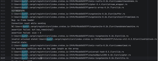 | Username do desenvolvedor | byst4, identificado consistentemente nos paths de crates Rust: tokio, tungstenite, chacha20poly1305, cipher, generic-array, futures-util |