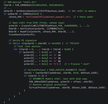 A técnica mais sofisticada desta fase é o overwrite da seção .text da ntdll.dll em memória com a versão limpa lida do disco.