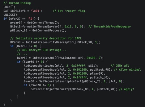 Para operações sensíveis, o malware implementa indirect syscalls: os syscall numbers são lidos diretamente da ntdll em disco e stubs são construídos em memória, contornando qualquer hook que pudesse ser reinstalado. Por fim, aplica thread hiding via NtSetInformationThread com o flag ThreadHideFromDebugger, modifica a DACL do próprio processo para negar acesso externo, e configura SetWindowDisplayAffinity nos overlays para que screenshots exibam apenas tela preta.